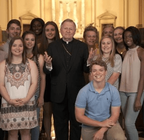 There are two versions of the commercial – quick hits designed to be inviting and not proselytizing. Each features the code words of fellowship, purpose and service. Each ends with a quick message from New Orleans Archbishop Gregory M. Aymond as he stands with a group of young adults: “All are welcome!” and “Come join us!”