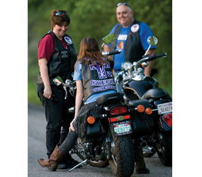 The Stancos wear their leather vests with the purple-and-white patches of the Catholic Cross Bearers on the back to as many events as possible. Whenever they ride or attend an event, they carry what Jessica Stanco calls “evangelist packets,” which include a rosary and a brochure explaining who the Catholic Cross Bearers are and what they do.
