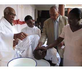 A priest who remains hospitalized after being injured in the earthquake could not stand as a godparent. Regular volunteers from Deacon Mortel’s home base in the Diocese of Harrisburg, Pa., such as Anne-Marie Jallon and Jeff Remington, stood for children, such as boys named Johnsley and Nesly, and a girl named Daphena.
