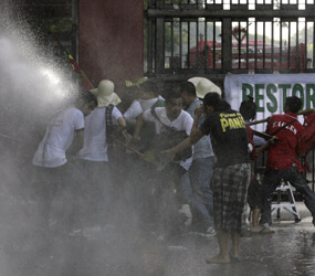 QUEZON CITY, Philippines – Church leaders criticized firefighters’ use of water hoses to disperse demonstrators, including Auxiliary Bishop Broderick Pabillo of Manila, at a rally outside Congress.