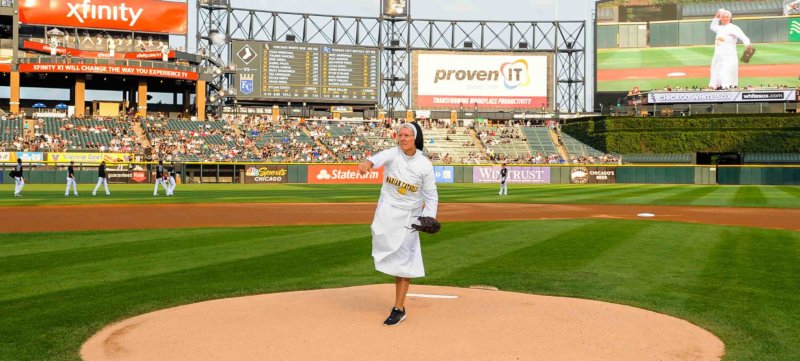 White Sox pitcher Lucas Giolito, who crouched at home plate to catch the nun’s toss, remarked to mlb.com after the game, “That was awesome. She had a whole routine. She had it planned out. I was just lucky to be back there. She threw a perfect pitch.”