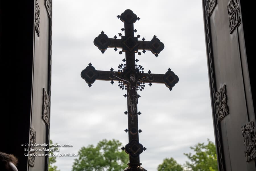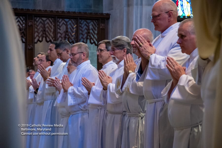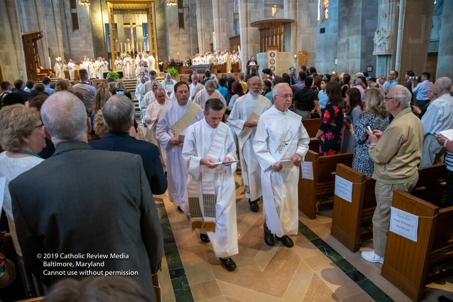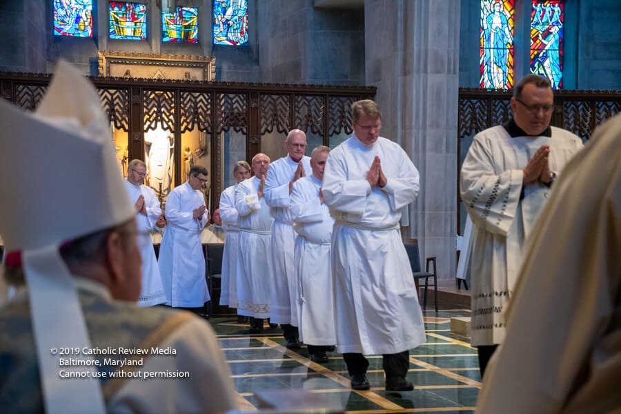 A medida que los 14 hombres esperaban para seguir a la guardia de honor de los Caballeros de Colón en la Catedral, uno pronunció, “aquí vamos, hermanos”. El padre Triplett siguió en procesión junto al padre Patrick Carrion, su predecesor en el programa de formación de diáconos. Fueron seguidos por monseñor Richard Woy, rector de la Catedral.