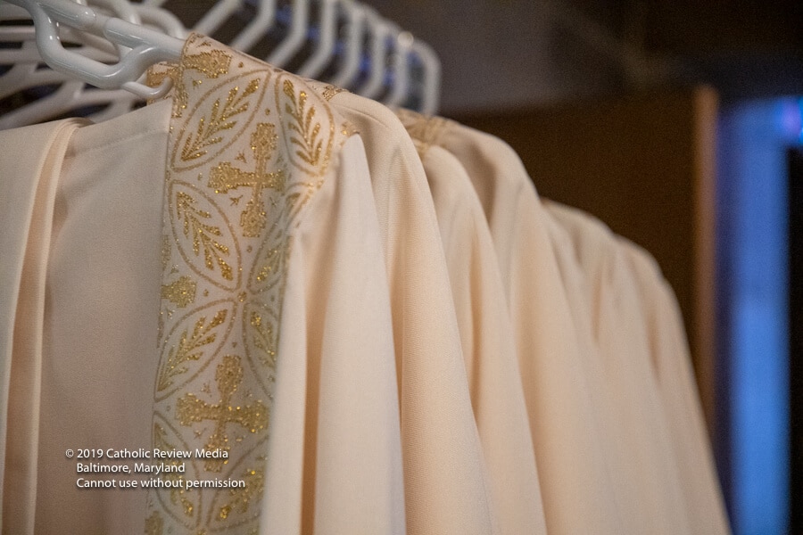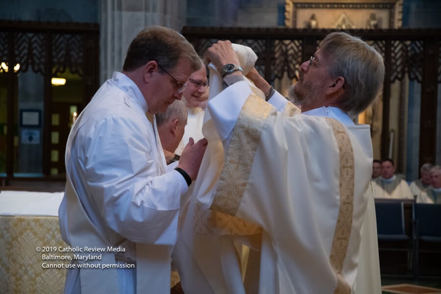 El diácono Rivera-Rivera fue revestido por el padre Ray Chase, quien supervisó su pasantía en St. Elizabeth Nursing Center, una dependencia de Caridades Católicas de Baltimore localizada en el campus de centro de vivienda para ancianos Jenkins Senior Living.