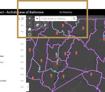 A few data layers already are displayed by default, including parish and pastorate boundaries, the location of active worship sites and Catholic schools, County boundaries, and roads.