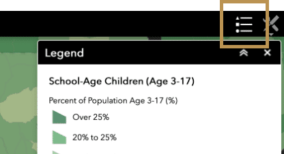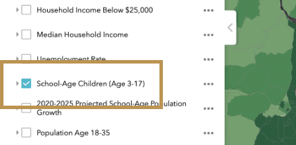 1. Select the data layer from the menu on the left-hand side of the screen that you wish to view. In the image, the School-Age Children layer has been turned on.