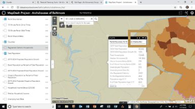 Most of the data available on the public-access version of MapDash draws from Census data for existing and projected populations, though some draw from Archdiocesan data. These data layers either contain point data (such as the location of an individual worship site), Census block group data (for instance, Projected Population Growth), or calculated data (including walk and drive times from worship sites).