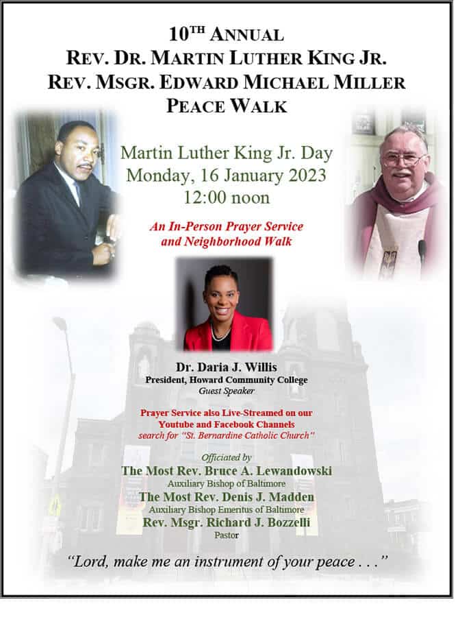 St. Bernardine Catholic Church with Historic St. Peter Claver invites you to its 13th Annual Rev. Dr. Martin Luther King Jr. & Rev. Msgr. Edward Michael Miller Peace Walk, to be held on Martin Luther King Jr. Day, January 19, 2026, at 12:00 p.m. This annual tradition gathers community members, civic leaders, clergy, and neighbors from throughout the region for a prayer service, a walk dedicated to peace, justice, and unity and a community gathering with chili and refreshments afterwards. This year’s event will feature Pulitzer Prize winner Taylor Branch as the guest speaker. He is recognized for his award-winning trilogy chronicling the life of Dr. King and the American Civil Rights Movement.