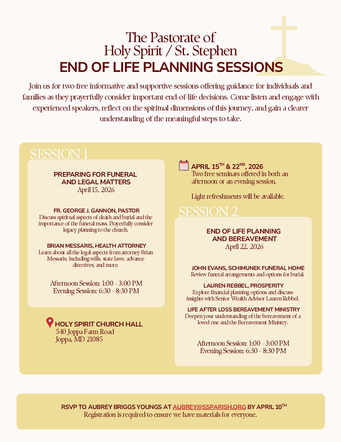Holy Spirit/St. Stephen Pastorate; Sponsoring seminars on planning final arrangements. There will be an Attorney, a Financial Planner, a Funeral Director, a Priest and member of the Bereavement Ministry, who will each give a short presentation and take questions. April 22 1-3 p.m. or 6:30 – 8:30 p.m. All sessions will be held at Holy […]