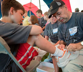 Hall worked at the shoe tent, also known as Samaritan’s Feet; where volunteers first prayed with and washed the feet of visitors, while volunteer runners fetched new shoes from a supply “store” that were then fitted on the recipients.