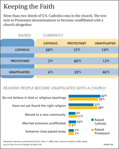 One-quarter of lifelong Catholics attended Catholic high schools, the survey said. Of Catholics who became Protestants, 16 percent went to Catholic high school, as did 20 percent of former Catholics who no longer are involved with a religious group.
