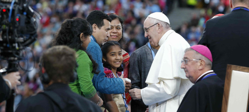 Families from India, Canada, Iraq, Ireland and Burkina Faso stood on stage near the pope while pre-recorded video versions of their testimonies played.