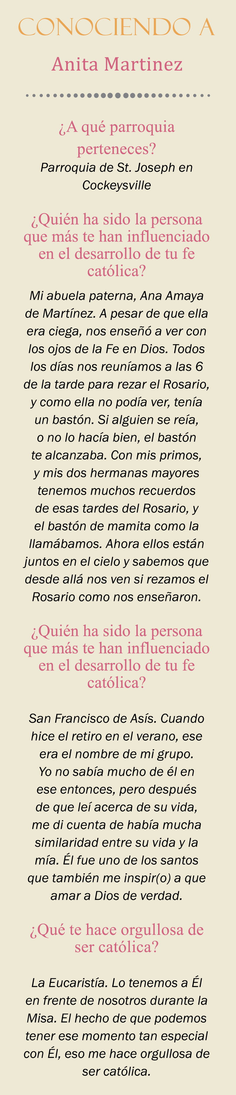 COCKEYSVILLE — La cara de Anita Martínez brilla de alegría cada vez que ella habla acerca de su fe católica.