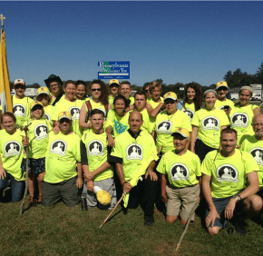 She was in tears as Father John J. Lombardi and 21 other pilgrims came walking from the south. Immediately, Smithson was surrounded by a sea of neon yellow T-shirts offering comfort. Paul and Paula Tiller, parishioners of Father Jack’s at St. Peter in Hancock, sang a hymn.