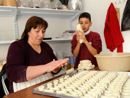Then she sets her family to work making Christmas cookies. Mixing margarine, semolina, yeast and boiling water with her hand, she begins the process.