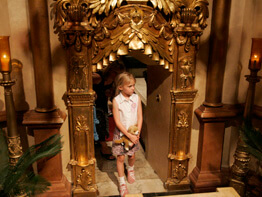 At the east end, below the altar of Thabor and a depiction of the Transfiguration, is a reproduction of the Holy Sepulcher, the tomb where Jesus’ body was buried. This is one of the Holy Land sites Leonori visited and measured to ensure the accuracy of its dimensions. Stucco reliefs covered in silver and bronze adorn the chambers of the sepulcher.