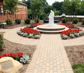 Shaped like a Celtic cross, the garden is anchored by a statue of Jesus lovingly holding a child in his arm and embracing another at his leg. Commissioned from an artist in Ecuador, the statue is raised on a platform, wrapped by red salvia and encircled by six crape myrtle trees interspersed with laurel bushes.