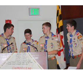 In order to achieve the rank, Patrick made lakeside recycling bins for fishing line; David built and installed five bat boxes at St. Louis; William helped a Howard County therapeutic and recreational riding center, while John built 12 steps that lead to a bird cage at a conservancy.