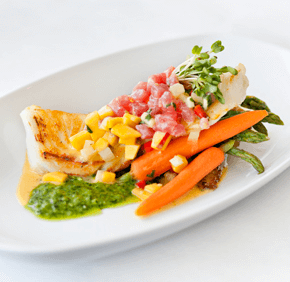 The signature fish dish, the Halibut St. Martin, gives a nod to Asian fusion flavors. The crusted filet, oven finished to perfection, is accented with a sweet-and-sour Thai chili sauce infused with fresh-grilled fruit. The base – blanched asparagus, baby carrots and oven-roasted fingerling potatoes – makes this a fulfilling meal. At $27, this near-perfect execution, exemplifies the type of attention to detail that makes this place truly gourmet.