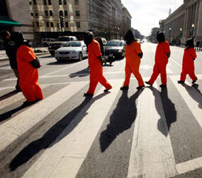 About 200 people gathered for the kickoff of an 11-day series of events in Washington to raise awareness about the Guantanamo situation. About 40 people were dressed in orange jumpsuits – similar to those worn by the 198 detainees remaining in the prison – and processed under the direction of a member who portrayed a soldier in camouflage. Other demonstrators carried signs urging the president to uphold his pledge.