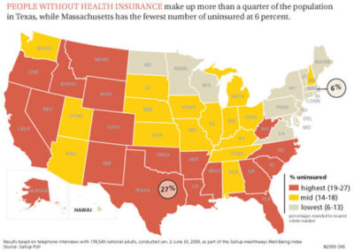 At the other end of the spectrum, more than a quarter of the residents of Texas and New Mexico were without health insurance, according to Gallup, while 22 to 24 percent of those in Mississippi, Louisiana, Nevada and Oklahoma were uninsured.