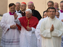 Pope Benedict said Mary, as the loving mother of her son’s followers, “helps us, encourages us so that every moment of our existence would be a step in this journey toward God.”