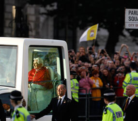 LONDON – Groups of hecklers greeted Pope Benedict XVI at various stops in London, holding up banners condemning clergy sexual abuse and demanding the pope’s resignation.