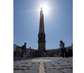 A long, thin granite strip running from the obelisk toward the pope’s window and through one of the fountains acts as the meridian: a line that indicates when the sun has reached true or solar noon and is at its highest point in the sky.