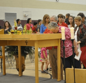 Families processed out the parish’s bound sacrament records, followed by its sacred oils, a chalice, and a large icon of Jesus washing the Apostles’ feet. Parishioners then processed to the center of the room, where they kissed or touched the wooden altar. As they left, parishioners hugged one another, many laughing and crying.
