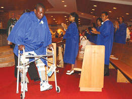 With cheers and chants from classmates and the rest of the audience, Juwan received a standing ovation as he transferred from wheelchair to walker, moving along fairly quickly to retrieve his diploma, his legs wrapped in full braces, his body covered with a blue graduation gown.