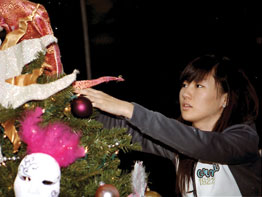 The design team for this year’s projects was led by senior Breona Byrd, whose gingerbread house designs have won awards the past two years. This year’s theme for the 7-foot gold tree was “Venetian Masquerade,” with various masks painted pale pink, pearl white, purple and gold, and embellished with feathers of the same colors, gold Christmas balls, and pearls snaking around the masks, emulated after decorated masks produced in Venice, Italy. The 2-foot tree boasted Disney princesses and the gingerbread house featured a “Wizard of Oz” theme made of fondant and tinfoil. Snow covered the wreath featuring snowballs and snowmen.