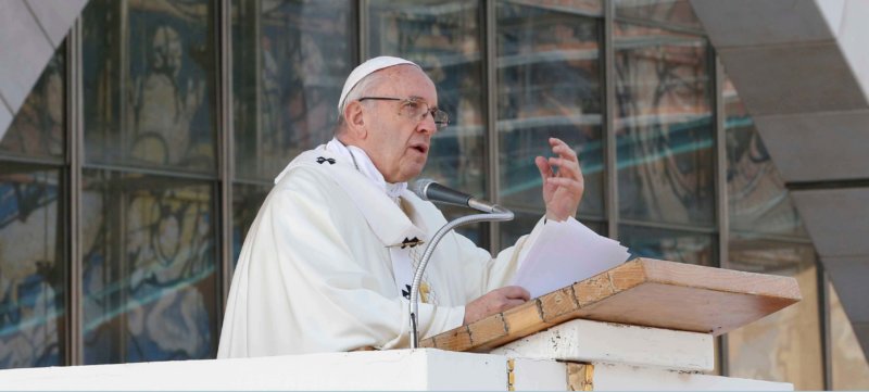 Pope Francis celebrated the Mass outside the Shrine of St. Pio of Pietrelcina with about 30,000 people after visiting children in the cancer ward of the hospital St. Pio founded, Casa Sollievo della Sofferenza (House for the Relief of Suffering).