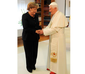 The pope met privately with Merkel, and she said afterward they discussed the financial markets and the duty of politicians to ensure the markets work for the common good.