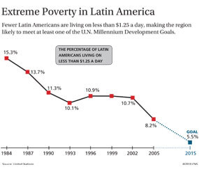 The percentage of Latin Americans living on less than $1.25 a day dropped from 11 percent in 1990 to 8 percent in 2005, making the region likely to meet its goal of 5.5 percent by 2015. High demand for export commodities like soy, copper and other metals has buffered many Latin American nations from the worst of the international crisis.