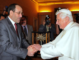 Before meeting with the pope, al-Maliki also attended a 45-minute closed-door meeting with Cardinal Tarcisio Bertone, the Vatican secretary of state, and Archbishop Dominique Mamberti, the Vatican’s chief foreign affairs official.