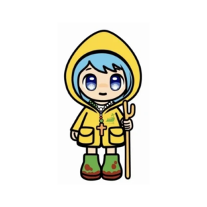 Luce is the official Vatican mascot of Jubilee 2025. Reflecting the “Pilgrims of Hope” theme, Luce is dressed in a yellow raincoat and green boots muddied from her long journey. Her missionary cross and pilgrim staff serve as guiding aids in her travels.
