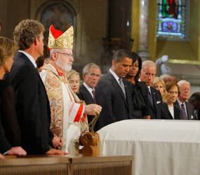 BOSTON – Sen. Edward M. Kennedy was mourned at a Boston church and laid to rest at Arlington National Cemetery Aug. 29, amid words of comfort from the Book of Wisdom, Paul’s Letter to the Romans and the Gospel of Matthew, and recollections of his life by his sons, his pastor, President Barack Obama and Cardinal Theodore E. McCarrick.