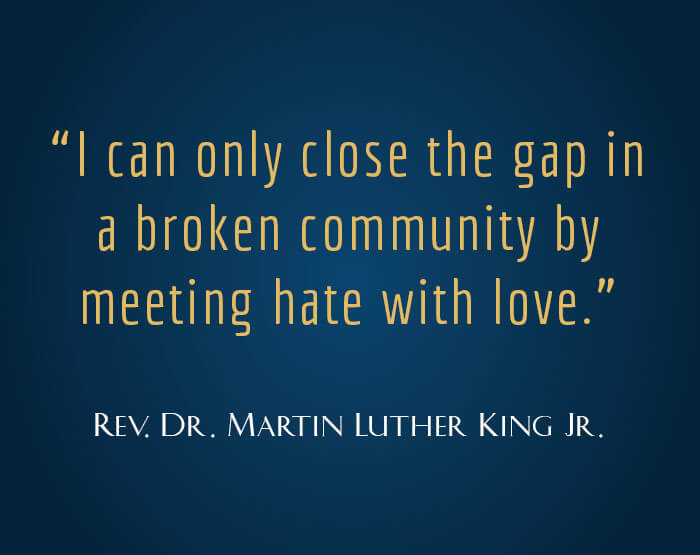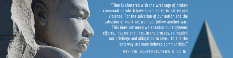 Let us be clear: Dr. King’s principles are meant to change us and in changing us to change our society. They are addressed first and foremost to the heart, calling us to conversion, a conversion that leads to a different way of thinking, speaking and acting. They urge us to leave behind “business as usual” and instead to find ways not only to come together but to stay together for the long haul, in peaceful dialogue and cooperation for the sake of each person’s dignity and for the common good. Thus, if we truly allow Dr. King’s principles of nonviolence to guide us to conversion, we will not be content to camouflage our problems but rather be spurred into action; we will be moved to address and resist injustice in our community. Ultimately, however, it is only a change of mind and heart on the part of many that will lead to a new beginning for us and our beloved community.