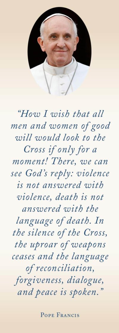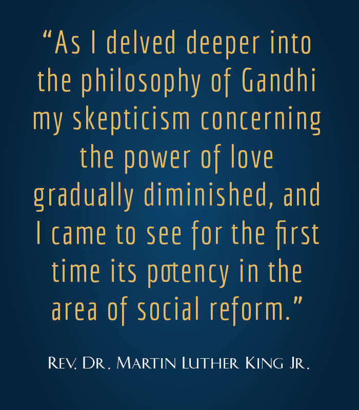 Many years ago, St. John Paul II said, “The contemporary world … needs the witness of unarmed prophets who are often the objects of ridicule.” Dr. King was himself one of these “unarmed prophets” who taught us to resist evil actively without resorting to violence of any sort. Embracing his teaching requires of us courage, that is, a deep spiritual strength. Courage summons our spiritual, mental and emotional resources so that we can speak and do the truth in love (cf. Eph 4:15). Renouncing physical, verbal and emotional violence, as Jesus did when the temple guard struck him (Jn 18:22), the nonviolent person instead bears witness to the truth by living it and seeks not to coerce others into conformity but rather to persuade them in love. Living and acting in this way can be risky. We derive the courage to overcome the skepticism and cynicism of the world around us through friendship with Jesus in the power of the Holy Spirit. Thus for us to live this principle as followers of Christ, we must rely on the strength of the Holy Spirit, whose gift of courage we received in the Sacraments of Baptism and Confirmation. Such courage prompts us to resist injustice by persuasion, negotiation, personal witness, use of the media and, when necessary, peaceful protest.