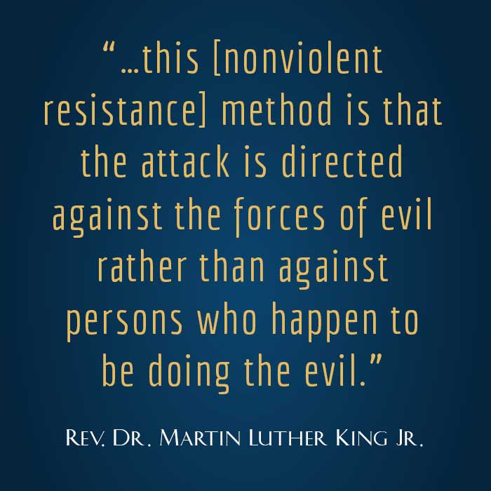 Let us be clear: Nonviolence is anything but indifference to injustice. It does not deal in euphemisms that make vice seem like virtue. To be authentic, the nonviolent word must also be a prophetic word – a godly and courageous word that calls out injustice and warns against its consequences for persons and society. A prophetic word recognizes that injustice undermines the humanity of both perpetrator and victim and tears at the very fabric of society. It is spoken not to create partisan or ideological winners and losers but rather to create “a civilization of truth and love” where human beings can unlock their human potential, grow in virtue, and lead good, productive lives. The prophetic word is addressed with special intensity and conviction to those who would harm the innocent and defenseless. It strenuously seeks to deter such behavior. It also seeks to persuade, indeed to galvanize others, in taking the steps necessary to eliminate all forms of racism and unjust discrimination, as also those conditions in society that lead to violence. As Dr. King stated, “This [nonviolent resistance] method is that the attack is directed against the forces of evil rather than against persons who happen to be doing the evil.”