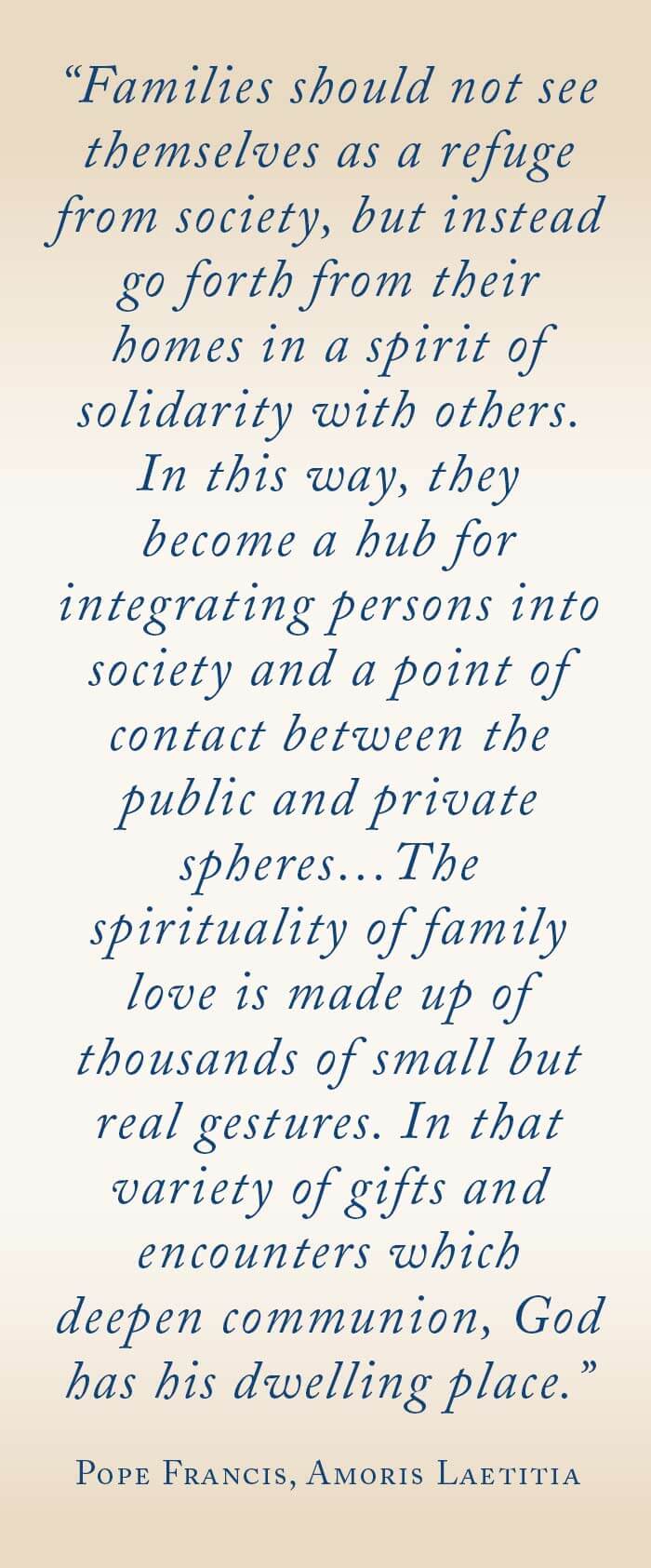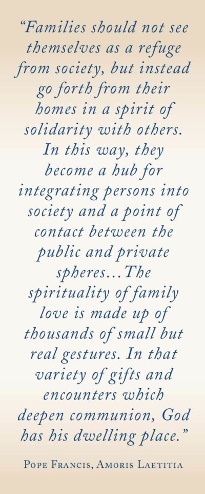 Self-giving love seeks no benefit for itself but rather seeks the good of the other, while at the same time seeking to build, not only personal relationships, but also communities, together with a sense of teamwork and collaboration for the common good. The love that springs from our relationship with Jesus Christ does not coexist with evil but seeks to overcome evil with goodness, violence and hatred with love. As Scripture attests: “Whoever does not love a brother whom he has seen cannot love God whom he has not seen” (1 Jn 4:20). In the same way, St. Paul urges us to “get rid of all bitterness, all passion and anger, harsh words, slander and malice of every kind.” In place of these, he teaches, “be kind to one another, compassionate and mutually forgiving, just as God has forgiven you in Christ (Eph 4:30-32). At the root of this form of love is the recognition that God loves each person tenderly, that God is rich in mercy, and that all human life is sacred. As a result, for all our differences, we are truly interrelated and called to extend to others the same tender love and mercy God has first shown us. Let me add that this form of love is best learned in the family, which is meant to be a kind of “school” of self-giving love. We cannot create a loving society unless it is made up of families where love and reconciliation are lived and exemplified.