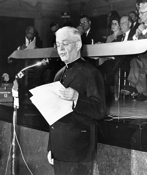 Councilmen who sat through the crowded three-hour session in the War Memorial Building were visibly impressed with the Cardinal’s bearing – and shocked at the rudeness of a large section of the crowd…the Cardinal called on the City Council to give leadership to the counties by passing fair-housing legislation first.