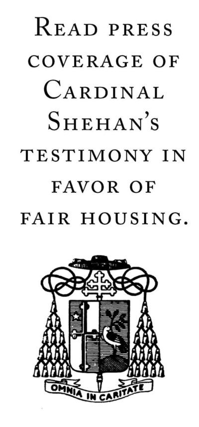 “Cardinal Shehan was booed twice last night by segregationalists who came to hear him testify before the City Council in favor of open occupancy legislation.