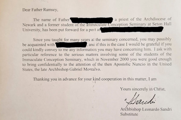 Then-Archbishop Sandri wrote to Father Ramsey, “I ask with particular reference to the serious matters involving some of the students of the Immaculate Conception Seminary, which in November 2000 you were good enough to bring confidentially to the attention of the then Apostolic Nuncio in the United States, the late Archbishop Gabriel Montalvo.”