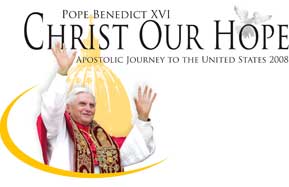 WASHINGTON – The logo for Pope Benedict XVI’s April 15-20 trip to the United States bears the message “Christ Our Hope” atop an image of Pope Benedict XVI with outstretched arms in front of the dome of St. Peter’s Basilica.