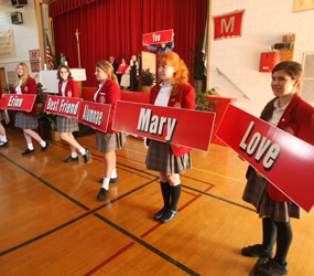 At the conclusion of Mass, the school celebrated the tradition of the May Crowning. May Queen Cecilia Volker, an eighth-grader at the school, walked with attendants Maeve Duffy and Rachel Higdon through a line of Maryvale students and placed a crown of flowers atop Mary’s head.