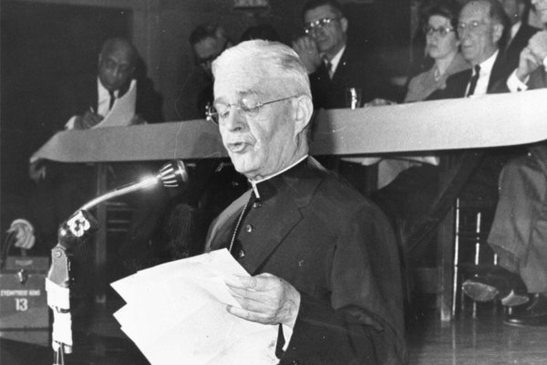 During a January 1966 hearing before the Baltimore City Council, Cardinal Lawrence Shehan testified in support of a fair housing bill. His appearance provoked boos and jeers from some in the audience. Others applauded his efforts.