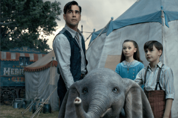 Colin Farrell plays circus horse wrangler Holt Farrier. Having lost an arm in World War I and his beloved wife to the influenza epidemic, Holt returns home in 1919 to find the fortunes of his small-time big top, run by Max Medici (Danny DeVito), sadly sagging. Max’s one ray of hope is the fact that a pachyderm he recently purchased is pregnant.