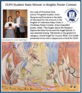 Dang, a seventh grader at Our Lady of Perpetual Help School in Ellicott City, drew the poster, “The Angels Adore His Majesty,” which earned her the top prize – a plaque and a check for $100. She was presented the awards by Grand Knight of Council 9638, Tom Smith.