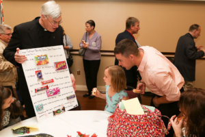 Men honored at St. Joseph Catholic Community in Eldersburg Sept. 9-10, when the Carroll County parish held its Clergy Appreciation Day. Marianist Father Neville O’Donohue, the pastor, is shown displaying a candy sign to members of his community. Also recognized were Marianist Father Dave McGuigan, Father John Worgul, Deacons Michael Dvorak, Vito Piazza and Karl Bayhi, as well as Marianist Brothers Jesse O’Neill and Justin Quiroz, who serve at Mother Seton Academy in Baltimore.