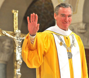 During the Mass, Garvey was presented with the symbols of his new office – the university mace, or scepter, the presidential medallion and chain of office. He wore the presidential regalia, an academic gown of the university’s official colors, gold and white, which mark the founding relationship the university has with the Catholic Church.